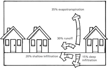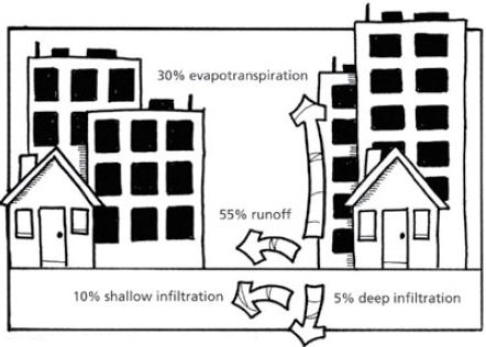 เราจะเห็นว่าน้ำฝนที่ตกในพื้นที่เมืองจะสูญเสียไปกับการไหลไปตามพื้นดิน (runoff)มาก และมีการซึมลงใต้ดินในปริมาณที่น้อยกว่า ทำให้เราสูญเสียน้ำที่ไหลจากที่สูงไปยังที่ต่ำโดยไม่ได้ใช้ประโยชน์มากกว่าพื้นที่เกษตร ทำให้สังคมเมืองต้องใช้พลังงานมากในการนำน้ำที่สูญเสียไปกลับมาใช้งานใหม่ทั้งโดยระบบประปา ระบบปั๊มน้ำ ระบบท่อ และอีกหลายๆ ทรัพยากรที่ต้องใช้เพื่อให้มีน้ำมาใช้งาน