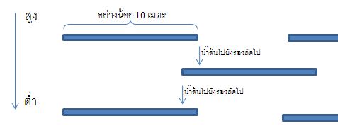 2. ในกรณีที่พื้นที่มีความลาดชันมาก อาจจะต้องขุดร่องชะลอน้ำ(swale)หลายร่อง ซึ่งควรจะต้องให้มีร่องชะลอน้ำซ้อนกันเพื่อรองรับน้ำที่ล้นจากร่องชะลอน้ำด้านบน เพื่อให้น้ำไหลช้าที่สุด