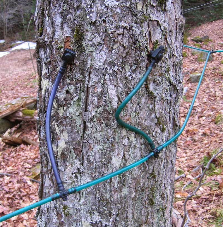 วิธีเก็บน้ำหวานจากต้นเมเปิ้ลแบบสมัยใหม่ เสียบท่อพลาสติกไปในต้นเมเปิ้ล แล้วต่อท่อไปยังถังเก็บรวม สะดวกสบายไม่ต้องเดินเก็บทีละต้น