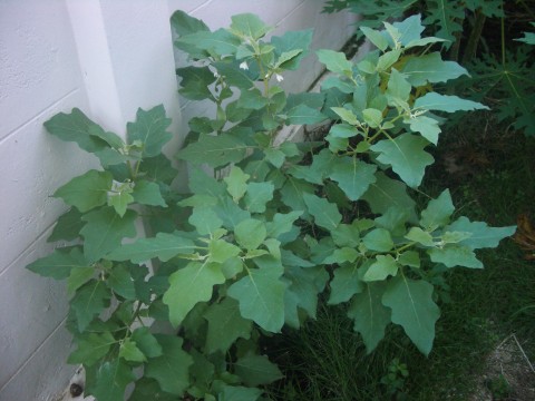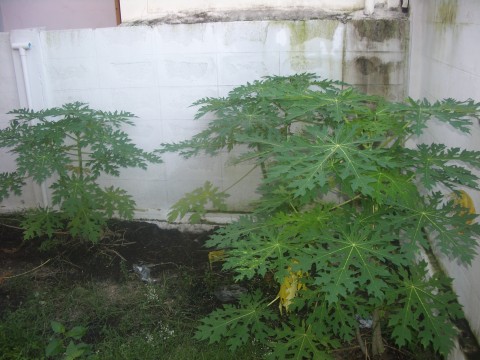 ที่เห็นเป็นพุ่ม ๆ อยู่ใต้ต้นมะละกอคือมะเขือเปราะ นัทมีอยู่ทั้งหมด 7 ต้น เมื่อก่อนมะเขือเปราะต้นใหญ่กว่ามะละกอ แต่ตอนนี้มะละกอสูงใหญ่กว่ามะเขือเปราะแล้ว