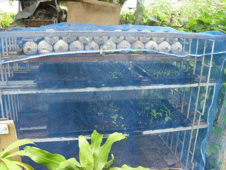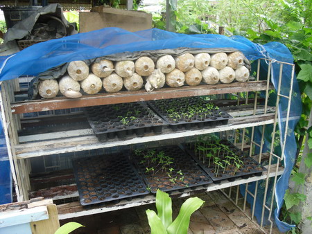 นอกจากใช้ด้านบนวางก้อนเชื้อเห็ดแล้ว ด้านล่างก็วางถาดเพาะต้นไม้