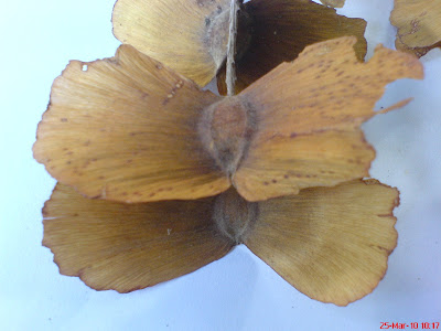 วันนี้คำถามมาเร็วหน่อย เมื่อเช้าขณะที่เตรียมขึ้นมุงหลังคาเล้าไก่ ก็หันไปเห็นลูกของต้นไม้หนิดหนึ่ง เห็นแปลกตาดีเลยถามพ่อว่าต้นมันอยู่ที่ไหน ที่แท้ก็อยู่ในสวนหลังบ้านนี่เอง อายุเลยเลขสามแล้วเพิ่งรู้ว่าลูกของมันเป็นแบบนี้ คำใบ้ ไม้ยืนต้นขนาดใหญ่ คำเรียกมีพยางต์เดียว