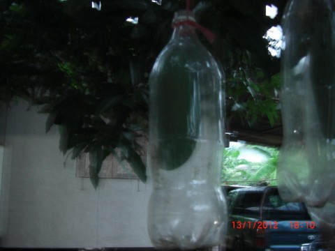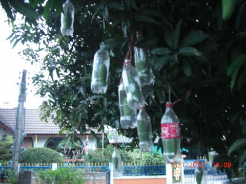 สวัสดีค่ะ จากภาพขอเดาว่า ผ่าก้นขวดแล้วก็เอามีดคัดเจอร์ผ่าด้านข้างจากก้นขวดไปถึงจุกขวดบน หลังจากนั้นก็นำเชือกมาผูกจุกขวดบนให้ติดกันแล้วยกขึ้นให้สูงจากขั้วมะม่วงนิดหน่อย เพื่อกันไม่ให้จุกขวดที่ผ่าไปทำลายขั่วมะม่วงให้บาดจ็บ :confused: