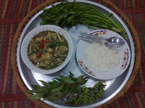 เมนูนี้ ซุปหน่อไม้กับลาบหมู ได้ผักจากสวนพี่เหมียวและสวนพี่สร้อยมาแนมค่ะ