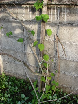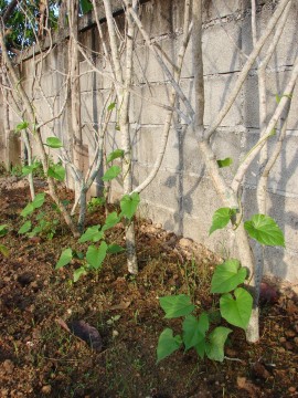 ขจร กำลังเลื้อยพันกิ่งไม้ ข้างล่างเป็นคะน้าไม่รู้จะโตทันหญ้าหรือเปล่า