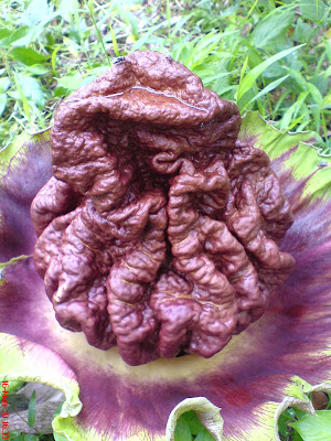 เมื่อวานไปเยี่ยมเพื่อนที่อำเภอบรรพตพิสัย เดินชมนั้น ชมนี้ ฉับพลัน!!!!!! ได้กลิ่นเหมือนอะไรเน่าๆ (กลิ่นเหมือนหมาเน่า) หันไปทางกลิ่นเห็นแมลงวันหัวเขียวกำลังตอมดอกไม้เต็มเลย ให้หลานถ่ายรูปให้ ถามว่าต้นอะไรเจ้าของบ้านก็ไม่รู้จัก เจ้เลยนึกถึงสมาชิกชาวบ้านสวนฯ ใครรู้จักต้นไม้ต้นนี้ช่วยให้ความกระจ่างหน่อยนะค่ะ