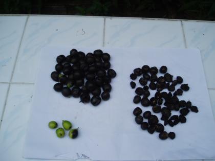 เมล็ด ( ผล ) : ผล อ่อนที่ยังไม่สุกจะมีสีเขียว และแข็ง ผลที่สุกแก่เต็มที่นั้นสีจะเปลี่ยนเป็นสีดำเทาอ่อนนุ่มนิ่ม ผิวจะมัน ผลโตประมาณ 1-1.5 เซนติเมตร และมีรสหวานเอียนๆ ผลนั้นจะแก่ในหน้าฝนประมาณเดือน มิ.ย.- ก.ย.ส่วนเมล็ดโตขนาดเท่าปลายนิ้วก้อย