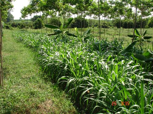 ต่อมาอีกระยะหนึ่ง ยางเริ่มโต หญ้าเนเปียแคระเริ่มตาย แต่ยังเก็บรักษาท่อนพันธุ์ไว้อยู่ครับ