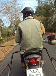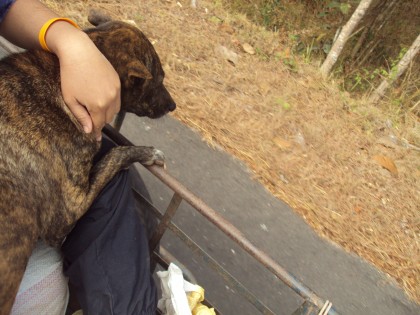 ก็อย่างที่เห็น แดงกับอุ๋มอิ๋ม ต้องมานั่งบนกระสอบปุ๋ยบนรถเข็น ชาวบ้านผ่านไปมาเห็นก็ยิ้ม ภาพแบบนี้ชาวบ้านแถวนี้ชินตาแล้วค่ะ สำหรับครอบครัวสองคนกับหนึ่งหมา
