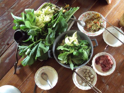เที่ยงทำกับข้าวกินกัน แดงมีหน้าที่ล้างผัก อ้ายเวทย์กำลังสับบักหุ่ง