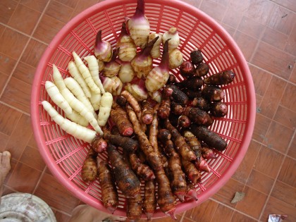 ภาพนี้ เป็นอาหารที่ขุดมาจากดิน สาคูขาวมีอยู่ตั้งนานแล้วแต่เพิ่งรู้ว่ากินได้(จากบล๊อกคุณแซมกับป้าเล็ก) บอนดำขุดของเพื่อนบ้านมา ยังมีอีกเยอะเจ้าของเขาไม่สนใจใยดีแล้ว แต่มีค่าสำหรับเรา ตอนเย็นจะไปขุดส่งให้คุณแก่และ สมช.ที่สนใจ สาคูวิลาศ ที่บ้านแม่มาเยอะมาก เลือกหัวอ่อนมาต้ม แต่แม่บอกว่าหัวแก่อร่อยกว่า เชิญแลกเปลี่ยนความเห็นกัน ตามสบายนะค๊ะ