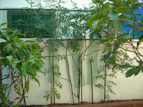 ภาพนี้เป็นต้นมะเขือเทศที่เอาเมล็ดจากสวนกุ้งไปปลูกค่ะ สูงเท่ากำแพง ปลูกที่เมืองไทยนะคะ เพื่อนพี่ตู่แกปลูกค่ะ ตอนที่ถ่ายยังไม่มีลูกค่ะ