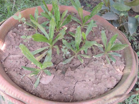 ผักชี ตอนแรกปลูกลงดินงามมาก มีลูกขึ้นเยอะแยะ แม่ไก่พาลูกมาเขี่ยประจำเวลาเราเผลอ เหลือไม่เท่าไรเลย ต้องย้ายหนีมาปลูกในกระถางบางส่วน