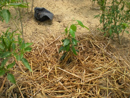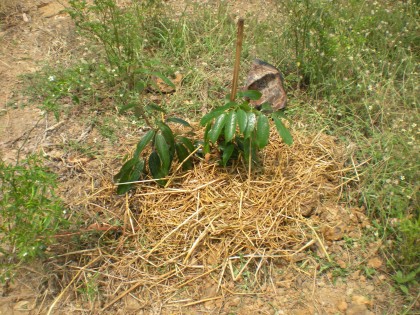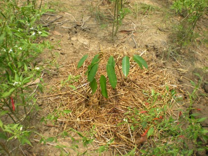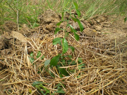 ปลูกเสร็จใช้เศษฟางคลุมรักษาความชื้นหน้าดินครับ เริ่มด้วยกล้วยหอมทอง 3 ต้น