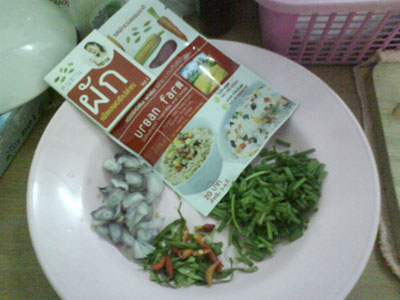 และแล้วก็รวบรวมเครื่องปรุงได้ ดังต่อไปนี้ค่ะ ใบหอมกับใบกระเทียม ที่เก็บมาจากหลังห้อง หอมแดง พริก ใบมะกรูด ที่เหลือจากการทำอาหารวันเสาร์ที่ผ่านมา