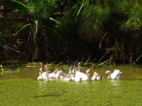 ผมเลี้ยงห่านยังไม่ถึงปีนะครับ เดิมที มีพ่อพันธุ์ 1 ตัว แม่พันธุ์ 3 ตัว ออกลูกแล้ว 2 คอก รวมเป็น 18 ตัว ขายลูกห่านออกไปแล้ว 6 ตัว ตอนนี้เหลือห่าน 12 ตัวครับ กินจุมาก นานๆผมจะให้ข้าวเปลือกกินสักที บางวันที่ได้เข้าไปก็จะเอาเศษข้าวเศษผักที่กินเหลือไปให้ แต่อาหารประจำคือผักตบชวา กับ แหน บักหางเหย ขนมาให้กินครั้งหนึ่งกว่าจะหมดเป็นอาทิตย์ครับ