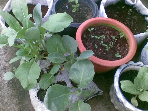 เห็นต้นกวางตุ้ง+คะน้าในกระสอบไหมค่ะ? กำลังน่ากินเลยนิ!