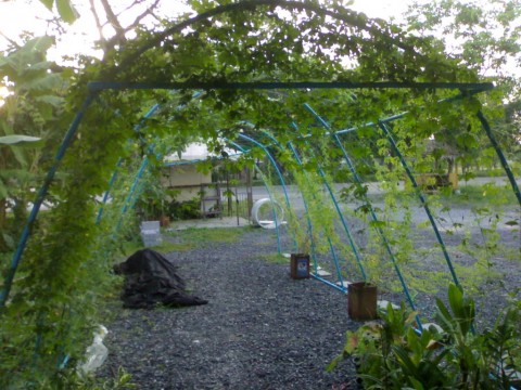 ซุ้มลอดทางเข้าบ้านตอนนี้ ได้ผลผลิตหลายอย่าง มะระขี้นกเก็บกินได้เป็นเดือนแล้ว