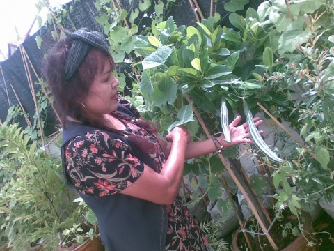 แหม่มก้มชี้ให้ตากล้องจับภาพถั่วฝักยาวที่ออกโคนต้นค่ะ