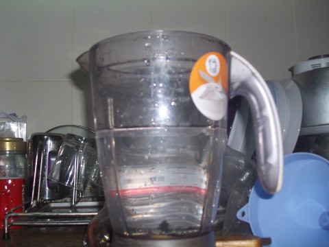 ตวงน้ำประปาที่ผ่านการพักน้ำไว้แล้วตามสัดส่วน (บังเอิญที่ตวงไม่ทราบเอาไว้ไหนเลยเอาที่ปั่นผลไม้มาใช้แทน)