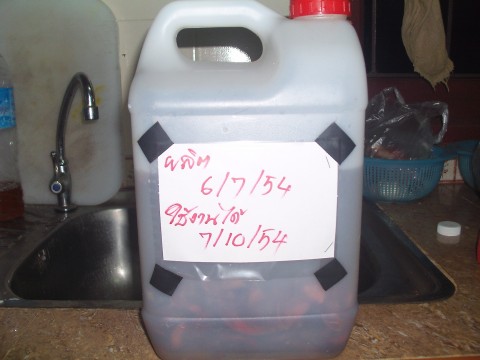 บรรจุลงในภาชะที่มีฝาปิดให้เรียบร้อย แต่ว่าปากภาชนะไม่ต้องปิดแน่นน่ะครับ ป้องกันการเป็นแก๊ซ ใช้เวลาหมัก 3 เดือน