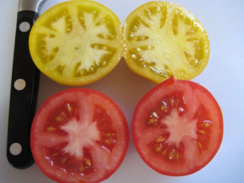 เลือกเอาลูกเน่าออกมาผ่าครึ่งดู ก็ไม่ได้เน่าไปทั้งหมด คือเน่าแค่ผิว แต่ไม่ได้เน่าทั้งผล ยังพอทานได้ ลองชิมทั้งสองสี ว่ารสชาติจะเป็นอย่างไร ก็ปรากฏว่า หวานอมเปรี้ยว ตามแบบฉบับของมะเขือเทศทั่วไป แต่ไม่มีกลิ่นเหม็นหืนของมะเขือเทศเหมือนกับที่เราไปซื้อมาจากตลาด อาจเป็นเพราะว่ามันแก่จัดเต็มที่มั้งเลยไม่เหม็นหืน
