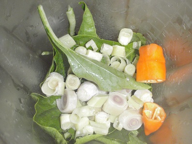 เครืองแกงมี พริกกับ ตระไคร้ ใบย่านาง ที่บ้านไม่มีใบย่านาง ทั้งสองท่านเลยแนะนำใบผักอย่างอื่นมา ผมมาจบลงที่ใบพริกหวาน ฝรั่งครับ ปั่นเข้าไปทั้งใบไม่ทิ้งกากเลยครับครู