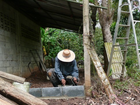 เตรียมพื้นที่เลี้ยงสัตว์ครับ ก็เลยต้องลงมือเอง งานเล็กๆพอทำได้ก็ต้องพึ่งพาตนเอง ถ้าจ้างก็คงหลายบาท ได้ทำ ได้เรียนรู้ครับ ไม่ได้จับเกรียง ผสมปูนนานแล้ว(สองปีที่ได้ไปช่วยญาติสร้างบ้าน)