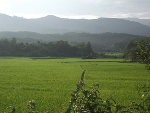 หมู่บ้านพี่น้องไทลื้อที่เราไปเยี่ยม ต้องนั่งรถยนต์ส่วนตัวผ่านภูเขาจากหลวงพระบางเข้าไปอีก ๔ ชั่วโมง ทุ่งนาข้าวเหนียวเจ้า..ยินดีหลาย หายเมื่อยนะเจ้า ให้คณะเดินเข้าหมู่บ้านเองจากต้นปากทางเข้า