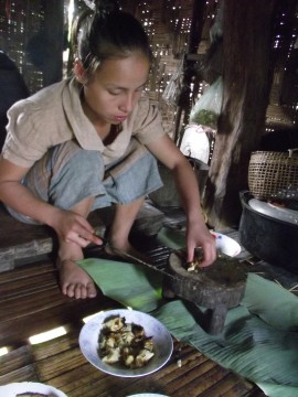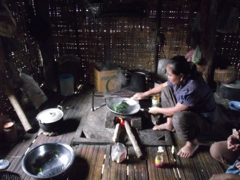 เดินทางไกลมาทั้งเหนื่อยทั้งหิว มาถึงเข้าครัวกันเลย บ้านและเครื่องเรือนพี่น้องไทลื้อทำจากไม้ไผ่จ้า ครัวสุดเรียบง่ายอยู่บนเรือนเล็กของบ้านฟากไม้ไผ่ป่าทั้งลำนำมาตีแผ่ออก ทนทาน ยืดหยุ่น ปลอดโปร่ง ใช้ไม่ฟืนหุงต้ม
