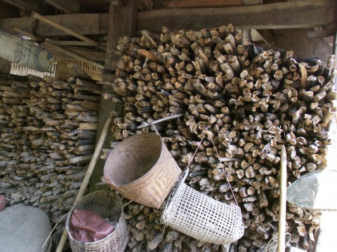 ผลาข้างบนหลังคาส่วนครัวเป็นที่เก็บอาหารแห้งและของใช้ ผ่านการอบไออุ่นจากเตาไฟทุกๆวัน ของไม่เสียหายกลับใช้งานได้ดีและปลอดภัย ธรรมชาติเกื้อกูลเป็นไปอย่างเหมาะสม