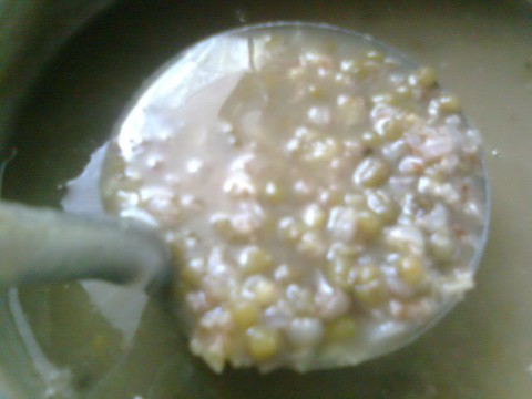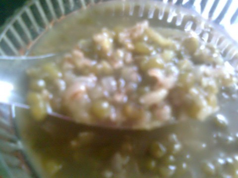 ถั่วเขียวต้มน้ำตาล ตามปกติ เสร็จ ลองแบ่ง(เผื่อนายหัว/น้องอาย ไม่ชอบ)ไปต้มกับข้าวสังข์หยดพัทลุงที่ต้มเตรียมไว้ ใช้ข้าวสาร 2 อุ้งมือค่ะ เพิ่มน้ำตาลเกลือนิดหน่อย อร่อยดี เพราะว่า..จะหอมน้ำข้าวด้วย