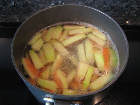 นำน้ำ 2 แก้ว (หรือมากน้อยตามจำนวนของแตงที่จะทำ) ไส่หม้อตั้งไฟให้เดือด