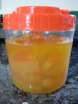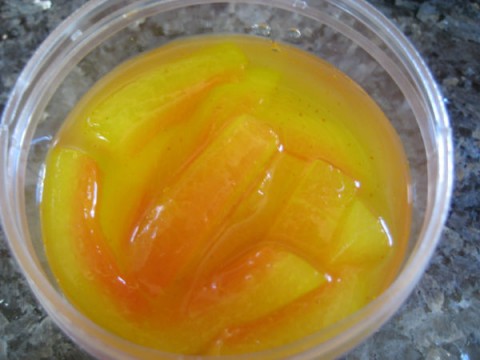 เมื่อเย็นแล้ว ก็เอาชิ้นแตงโมไส่ลงไปในภาชนะที่เราเตรียมไว้ เทน้ำที่ปรุงไว้ให้ท่วม คนให้เข้ากัน