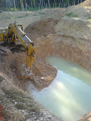 รถแบคโฮกำลังลงมาขุดสระต่อ จากที่เคยขุดไว้