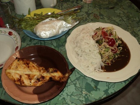 เสร็จงานบ้านเที่ยงพอดี กินส้มตำ ไก่ย่างกันค่ะ กิน2คน ลูกสาวไม่อยู่บอกว่าไปช่วยสอนคอมแทนคุณครู