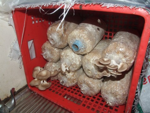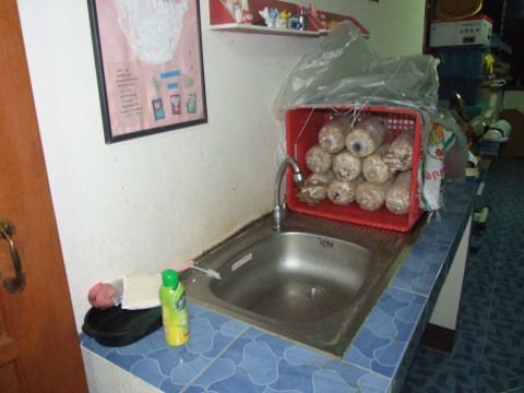 วิ่งไปในครัว มีเห็ด ไม่มีบ้านอยู่ ฝากไว้ที่ข้างซิ้งค์ล้างจาน เอาพลาสติกใสคลุมทิ้งไว้เฉยๆ แล้วรดน้ำทิ้งไว้ค่ะ