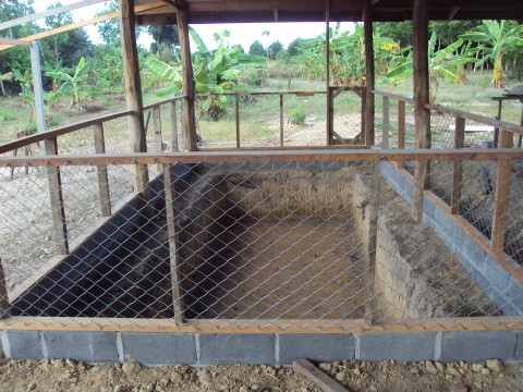 คอกหมูหลุมของอ้ายเวทย์ ตีตาข่ายสูงหน่อย เพื่อป้องกันหมา ลึกประมาณ 70 ซม.ถึง 1 ม. เอาเป็นว่าพอประมาณจะลึกจะตื้น กว้างยาวกว่านี้ก็ได้ คำนวณจากหมู 1 ตัว ต่อพื้นที่ 1.2 ตร.ม. คอกขนาด 2X3 ม. เลี้ยงได้ประมาณ 5 ตัว