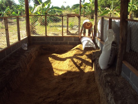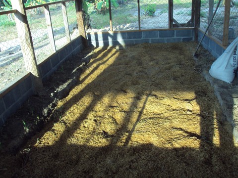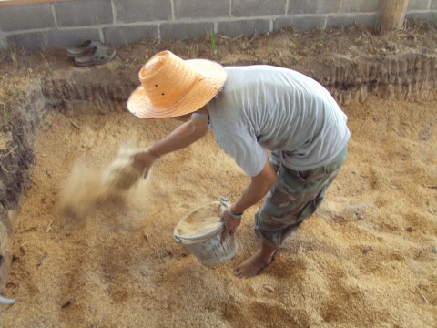 ผสมแกลบ ดิน รำ เกลือ ลงไปเป็นชั้น ๆ สูงประมาณ 30 ซม. แล้วราดด้วยน้ำอีเอ็มขยายหรือน้ำหมัก ทำแบบนี้จนเต็มหลุม ชั้นบนสุดโรยด้วยแกลบปิดหน้า หนาประมาณ 1 ฝ่ามือ ทิ้งไว้ประมาณ 7 วัน จึงค่อยนำหมูมาเลี้ยง