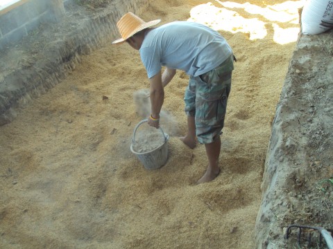 รดด้วยน้ำอีเอ็มขยาย หรือน้ำหมัก ให้ความชื้นพอหมาด ๆ (ความชื้นประมาณ 70 %)