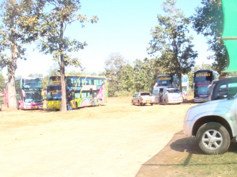 ถึงแล้วค่ะ มีแต่รถทัวร์ของนักท่องเที่ยวจากไทยทั้งนั้นค่ะ รถทัวร์พวกนี้ ขับในลาวอันตรายมากนะคะ เพราะพี่ท่านเล่นลืมตัว ขับเลนซ้าย ธนนันท์ยังหวาดเสียวไม่หาย เพราะก่อนเข้ามาถึงน้ำตก รถทัวร์ของไทยนี่แหละ ขับสวนออกไป เลนซ้ายด้วย ธนนันท์มารถตู้เลนขวา รถทัวร์เลนซ้าย...คิดดูสิคะ อีก 10 เมตร เอี้ยวออกแทบไม่ทัน ยังเปิดไฟใส่หน้ารถเราเฉยเลย พ่อลุงเลยด่าเข้าให้ "มาเหลือกตาใส่กูเฮ็ดหยังวะ!" เสียงในฟิล์ม ซาวด์แทร็ค...
