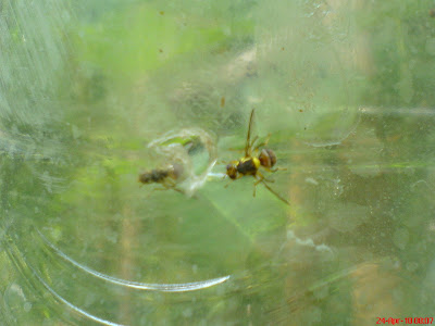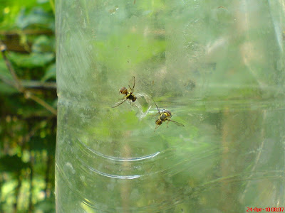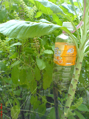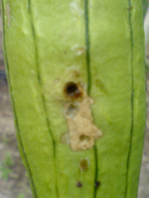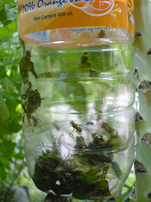 เห็นบวบงามๆอย่างนั้น มีรอยของแมลงวันทองเจาะครับ วันนี้ขอจัดการแมลงวันทองสักที ง่ายๆ ขวดน้ำพลาสติกใสเจาะรูเล็กๆ ด้านล่าง ขยี้ใบกะเพราใส่ลงไปปิดฝานำไปแขวน ไม่เกิน 5 นาทีแมลงวันทองเข้าไปอยู่แน่นอน
