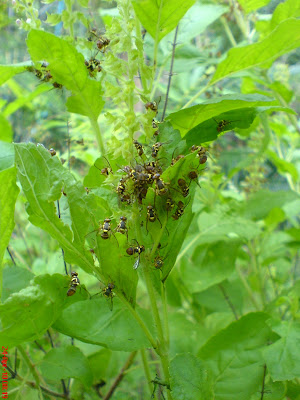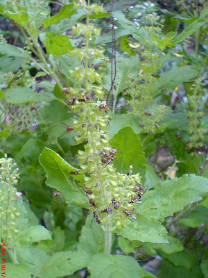 เมื่อเห็นแมลงวันทองมาเกาะที่ดอกกะเพราเยอะแยะแบบนี้ ทำให้ผมคิดได้ว่าถ้าเราปลูกกะเพราให้ออกดอกตรงที่ช่วงบวบติดลูกก็น่าจะดี แมลงวันทองจะได้ไม่สนใจบวบ แต่ขนาดว่ามันสนใจกะเพราอยู่ มันก็ยังมาเจาะบวบผมอยู่ดี