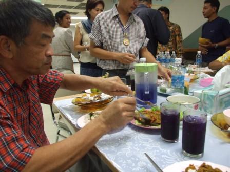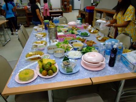 อาหารที่แต่ละคนนำมา รวมกับของหน่วยงานเตรียมถวายพระฉันเพล รวมทั้งน้ำอัญชัน๒ขวดด้วย