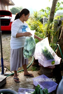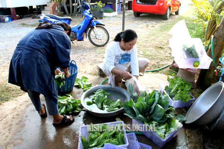 ที่ขาดไม่ได้ก็ผักสด ๆ ปลอดสารพิษ กรอบ หวาน อร่อย แม่กับลูกสะใภ้ช่วยกันตัดคนละไม้ละมือ