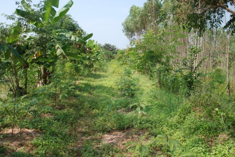 ขวามือเป็นแถวปลูกต้นฝาง กำลังออกฝัก ตรงกลางปลูกฝักหวานป่าที่มีต้นแคบ้านเป็นพี่เลี้ยง ซ้ายมือปลูกกล้วย พยุง ตะเคียนทอง สีเสียดเปลือก พยอม ยางนา ฯลฯ