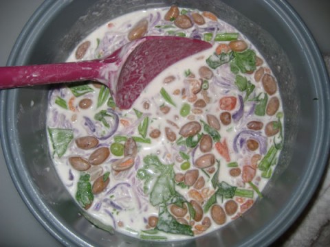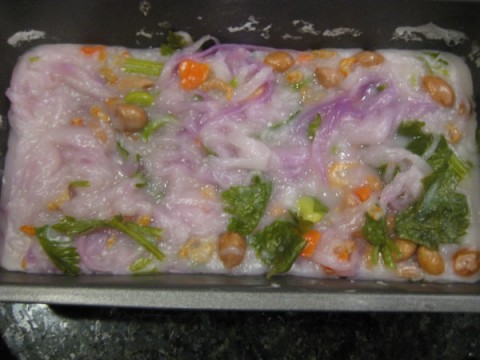 แล้วใส่หัวไชเท้าที่ขูดได้แล้ว 2 ถ้วยตวง กุ้งแห้ง1-2 อุ้งมือ, ถั่วลิสงต้ม 1 ถ้วยตวง, ใบคื่นฉ่ายกำนึง หรือจะใส่เยอะๆก็ตามใจคนชอบ, แป้งข้าวเจ้า 2 ถ้วยตวง, แป้งมัน 1/2 ถ้วยตวง