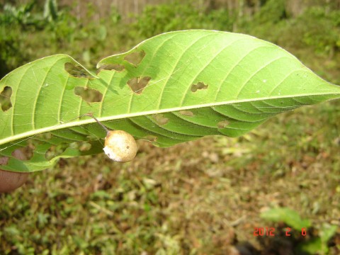 เดินมาอีกหน่อย เห็นอะไรกลมๆ 2 ใบ ห้อยอยู่ใต้ใบไม้