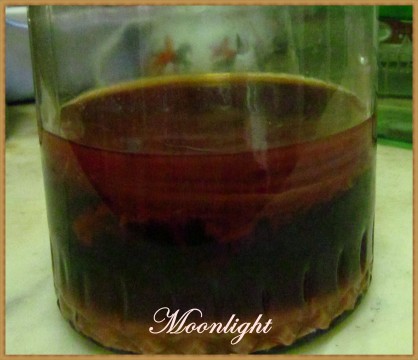 เมื่อ 6-7 เดือนที่แล้วหมักมังคุดไว้ ได้น้ำมังคุดสีสวย แต่วุ้นที่ได้ไม่ใส ดูไม่ค่อยน่าประทับใจ เลยตัดสินใจถ่ายน้ำออกจากถังที่หมัก แล้วนำน้ำหมักส่วนหนึ่งมาใส่โหลแก้ว ใส่วุ้นชิ้นเล็กๆลงไปหนึ่งชิ้น แล้วเติมน้ำผึ้งตามคำแนะนำของคุณครูธนนันท์ เพื่อจะได้เห็นความเปลี่ยนแปลงอย่างชัดๆ หนึ่งเดือนผ่านไป ได้วุ้นใสๆ เป็นชั้นๆ หน้าตาอย่างนี้