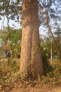 นี่ค่ะ...ต้นชาด...ใช้ประโยชน์ได้หลายอย่าง บ้านธนนันท์ตัดไม้ชาดมา 30 ต้น มาทำบ้านค่ะ...แล้วก็ตัดอีกเรื่อย ๆ เกือบทุกปี ทำนั่นทำนี่ตลอด...ต่อเติม ทำบ้านริมน้ำ ใช้ไม้พวกนี้แหละค่ะ ส่วนมากจะทำ "แป้น" พื้นเรือนค่ะ และก็ทำพวกเครื่อง ตง ขาง พวกนี้ค่ะ....เนื้อไม้จะไม่แข็งถึงไม้แดง แต่เนื้อจะเป็นสีแดง สวยค่ะ แต่เห็นย่าบอกว่าอย่าเอาต้นแก่มาก ไม้จะแตก เลือกที่อายุพอดี ๆ แต่ไม้แก่จะสีแดงสวย รู้เท่านี้ค่ะ...ใช้เป็นอย่างเดียว อ้อ!...ใบที่ร่วงหล่น จะเป็นปุ๋ยอย่างดี เพราะใบใหญ่ และมีเห็ดซ่อนอยู่ใต้ใบเน่า ๆ ด้วยค่ะ ต้องเปิดหา